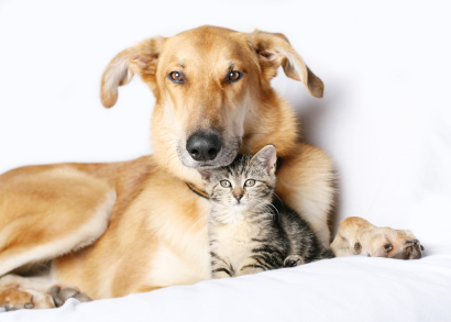 In the attached picture, we see a mature dog and kitty. Often these two species do not get along so amicably, but here we can read in a lot of what is going on by their body language.