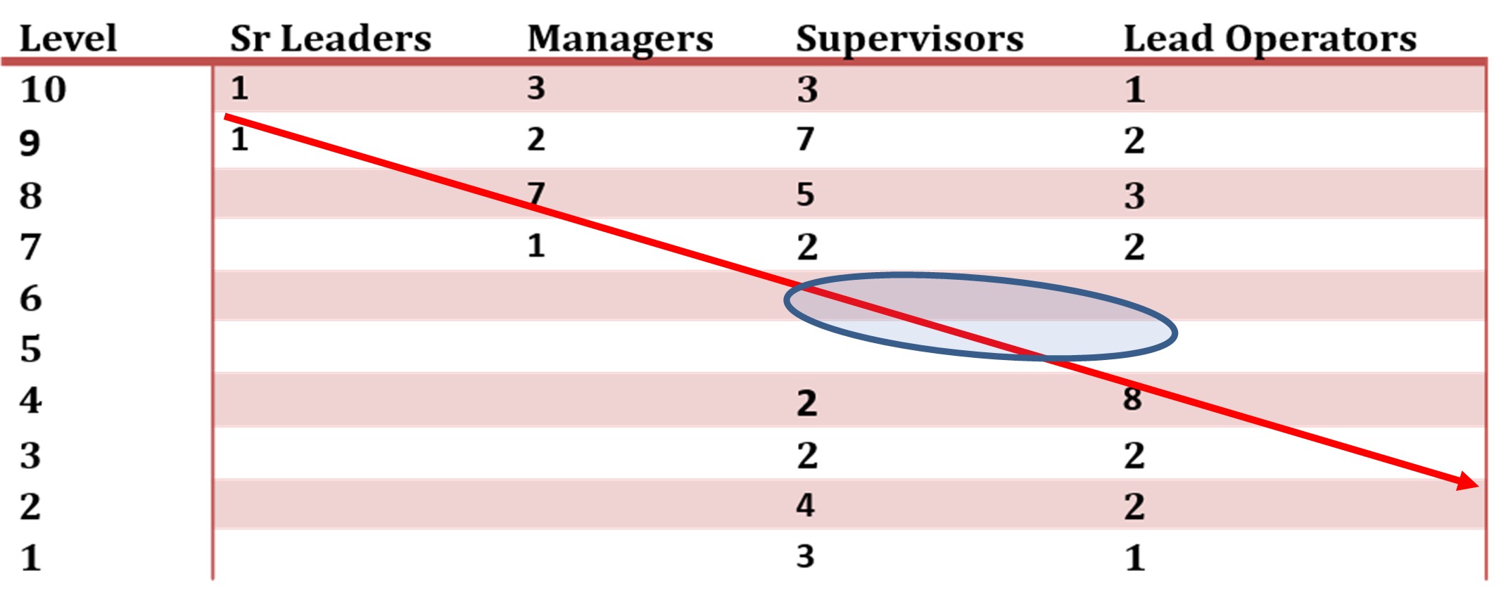 At the Supervisor and Group Leader levels, a curious “hole” in the data began to emerge in the area of 5-6.